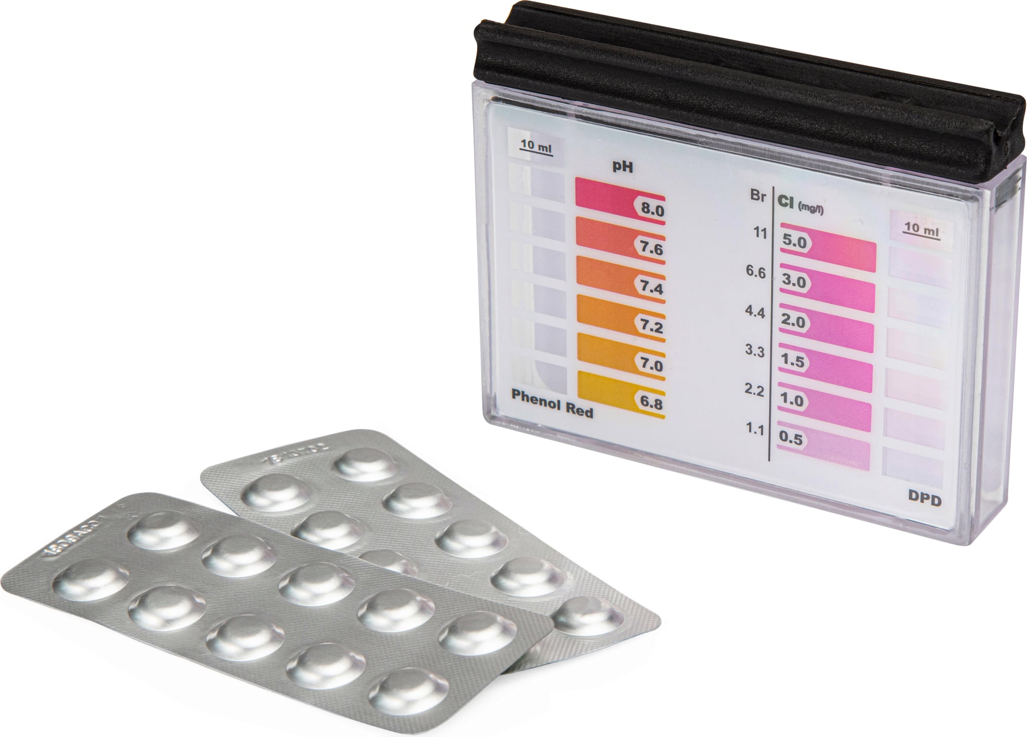 Ovakav tester se oslanja na jednostavan princip: uzorak vode reaguje sa tabletom (reagensom), promeni boju, a zatim se rezultat očitava na skali. Bez elektronike, bez komplikovanja – ali sa dovoljno dobrom preciznošću za kućne, sezonske i porodične bazene.